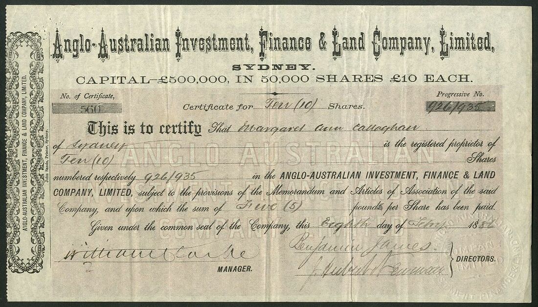 Australia: Anglo-Australian Investment Finance and Land Co. Ltd (of Sydney), £10 shares, 18[86]. #560, black, pink underprint. Debentures of this company are quite well know but this is the first share certificate we have seen in many years. VF.