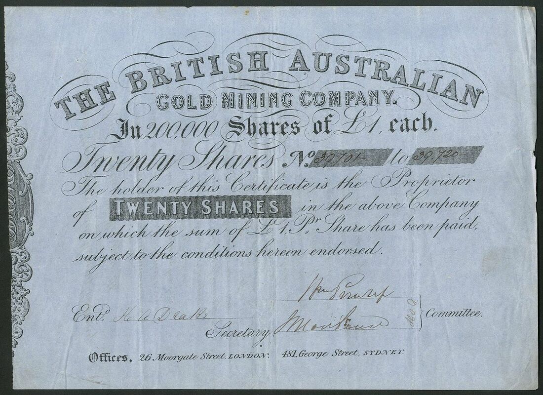 Australia: British Australian Gold Mining Company, 20 shares of £1, undated but 1851 on the reverse, #39701-720, black printing on blue paper. An early English company acquiring prospects in New South Wales. Small tear at right edge otherwise VF.
