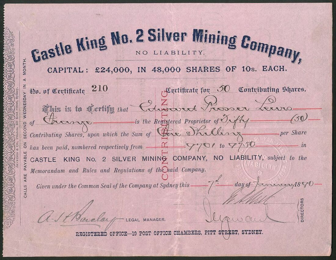 Australia: Castle King No. 2 Silver Mining Company, No Liability, 10s shares, 18[90], #210, black on pink paper, CONTRIBUTING overprinted in red. Mines in Deepwater, New South Wales. VF and scarce.