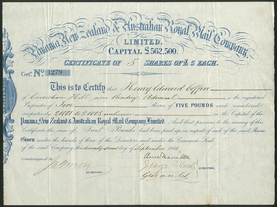 New Zealand/Australia: Panama, New Zealand & Australian Royal Mail Co. Ltd., £5 shares, 186[5], #1279, blue, embossed seal depicts sail asisted steamship. Formed by the Royal Mail Steam Packet Co. to provide a new service to New Zealand and Australia via Panama in 1865 and built four ships, S.S.Kaikoura, Rakaia, Ruahine, Mataura and purchased the Prince Albert as a reserve. The company had failed by 1868 and the ships were acquired by the Royal Mail Steam Packet Company to whom they had been mortgaged. VF and scarce.