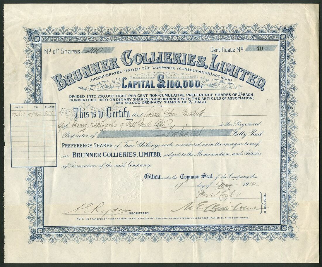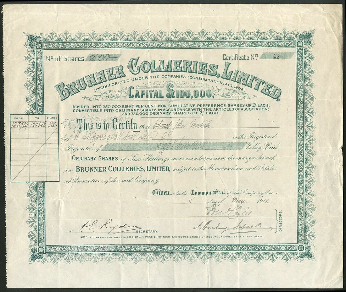 New Zealand: Brunner Collieries Limited, pair of certificates for 2/- ordinary shares, #42, green and 2/- preference shares, #40, blue, both dated 19[12]. Owned the Brunner mine at Greymouth, Grey District, South Island. It was the scene of New Zealand's worst mining disaster where, in 1896, 65 miners were killed by an explosion underground. VF (2).