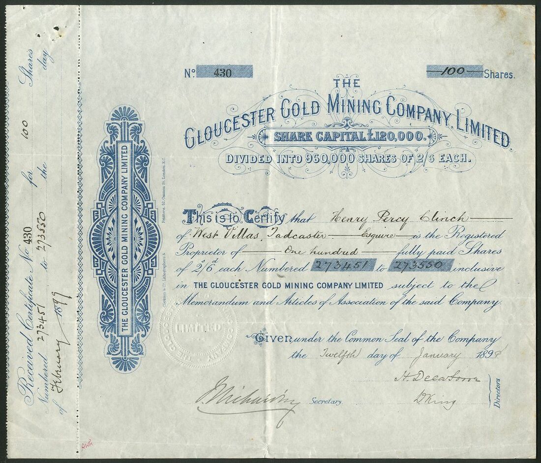 New Zealand: Gloucester Gold Mining Co. Ltd., 2/6d shares, fully paid, 189[8], #430, blue. Registered in 1896 to acquire the Auckland and Enterprise mines in the Hauraki Goldfield. GVF and rare.