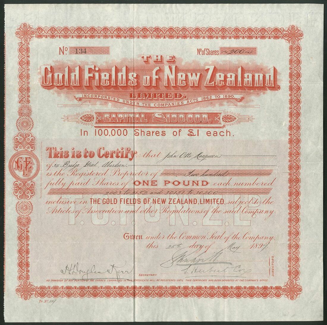 New Zealand: Gold Fields of New Zealand Ltd., £1 shares, 189[7], #134, decorative border, red. Registered 16th May 1895 to deal in and acquire properties in New Zealand. It had interests in New Zealand Broken Hill, Waitekauri Extended and Victor-Waihou. GVF and scarce.