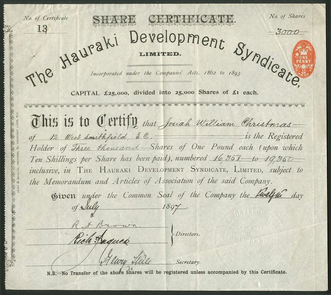 New Zealand: Hauraki Development Syndicate Limited, £1 shares, 189[7], #13, black. Registered 5th of February 1897. Properties at Coromandel, Hauraki goldfield, New Zealand. In liquidation December 1898. VF and scarce.