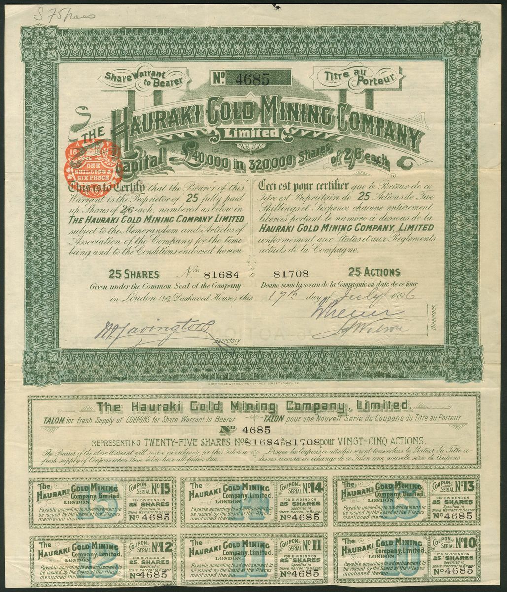 New Zealand: Hauraki Gold Mining Co. Ltd., bearer warrant for 25 shares of 2/6d, 189[6], #4685, ornate border, green, text in English and French, with coupons. Registered 5th December 1894 to acquire the Coromandel Special Claim near Auckland. GVF.