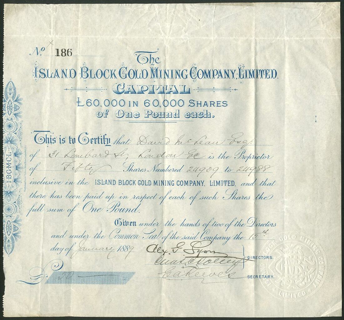 New Zealand: Island Block Gold Mining Co. Ltd., £1 shares, fully paid, 188[9], #186, scrollwork at left, blue. Registered 23rd November 1888 to acquire a lease covering parts of the Moa Flat Estate on the Clutha river, Otago, New Zealand.. VF-EF.