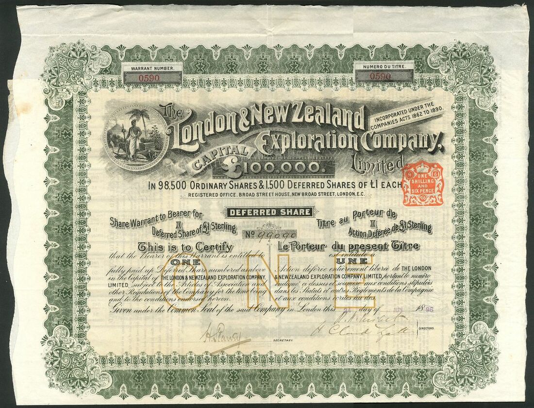 New Zealand: London & New Zealand Exploration Co. Ltd., bearer warrant for 1 deferred share of £1, 18[96], #0590, large format piece with Maori standing at left, ornate border, green and black with yellow underprint, with coupons. GVF.