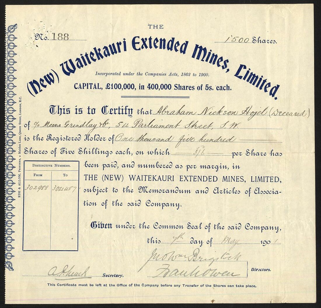 New Zealand: (New) Waitekauri Extended Mines Limited, 5 shilling shares, 190[1], part paid, #188, blue. Pinholes at top left, GVF and scarce.