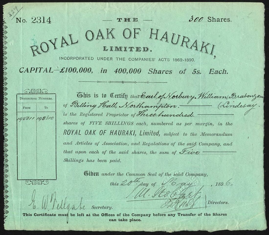 New Zealand: Royal Oak of Hauraki Limited, 5 shilling shares, part paid, 189[6], #2314, black on green paper. Registered 1895 to acquire the Royal Oak and Great Tokatea gold mines in the Hauraki Goldfields. Reconstructed in 1900 as a company of the same name. VF.