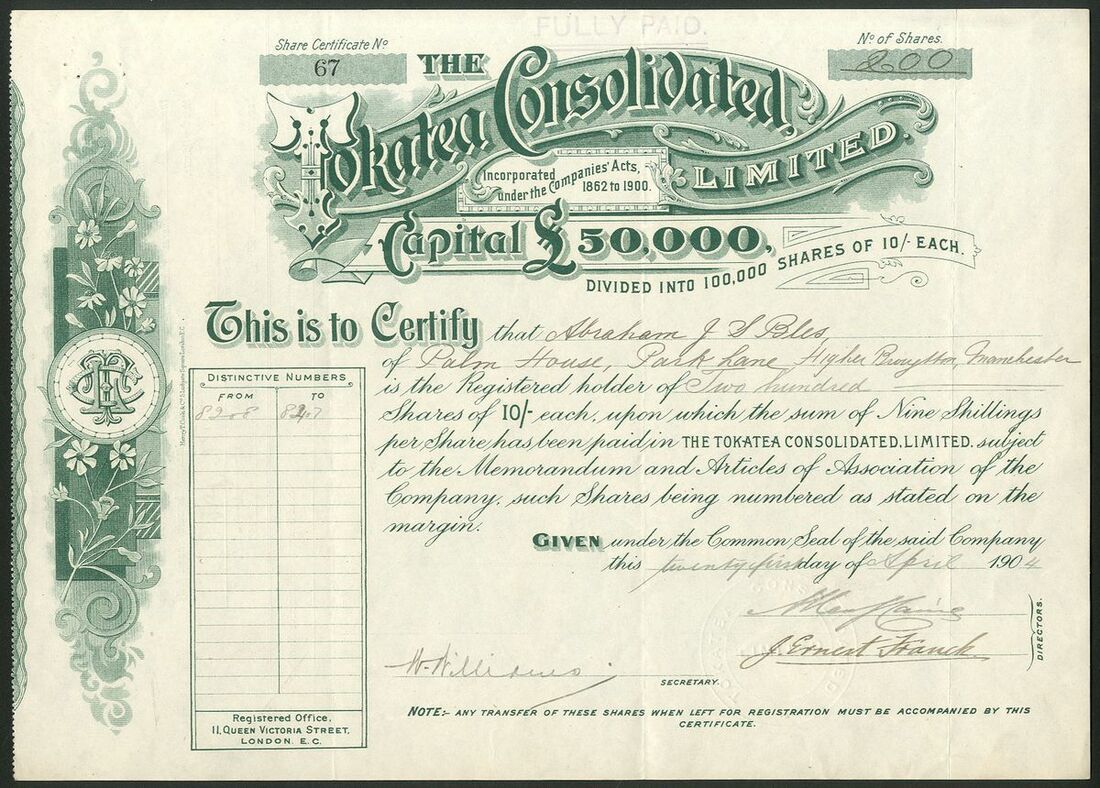 New Zealand: Tokatea Consolidated Limited, 10 shilling shares, 9 shillings paid, 190[4], #67, green. Registered 28th October 1903 to acquire leases in the Hauraki District of New Zealand. Acquired by West Mount Lyell in 1907 and company dissolved. GVF.