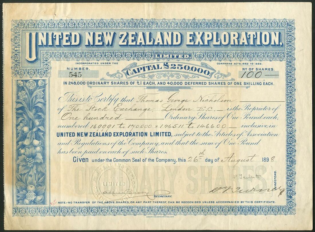 New Zealand: United New Zealand Exploration Limited, £1 Ordinary shares, 189[8], #545, ornate border, blue, printed by Waterlow & Sons. GVF but slight discolouration.