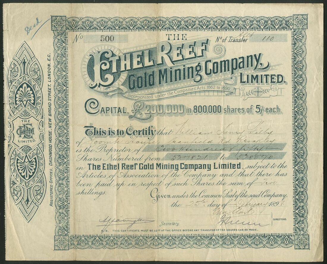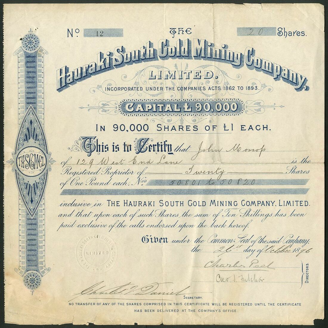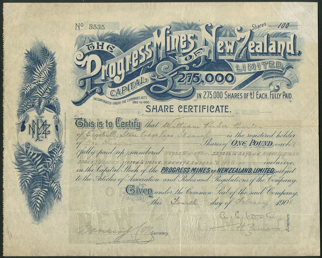 New Zealand: A trio of gold mining certificates, comprising Hauraki South Gold Mining Co. Ltd., £1 shares, 18[96], #12; Progress Mines of New Zealand Ltd., £1 shares, 190[8], #3535, and, Ethel Reef Gold Mining Co. Ltd., 5/- shares, 189[8], #500. The first with a few edge tears and tip of corner missing, the last with 50mm cut into bottom edge, F-VF (3).