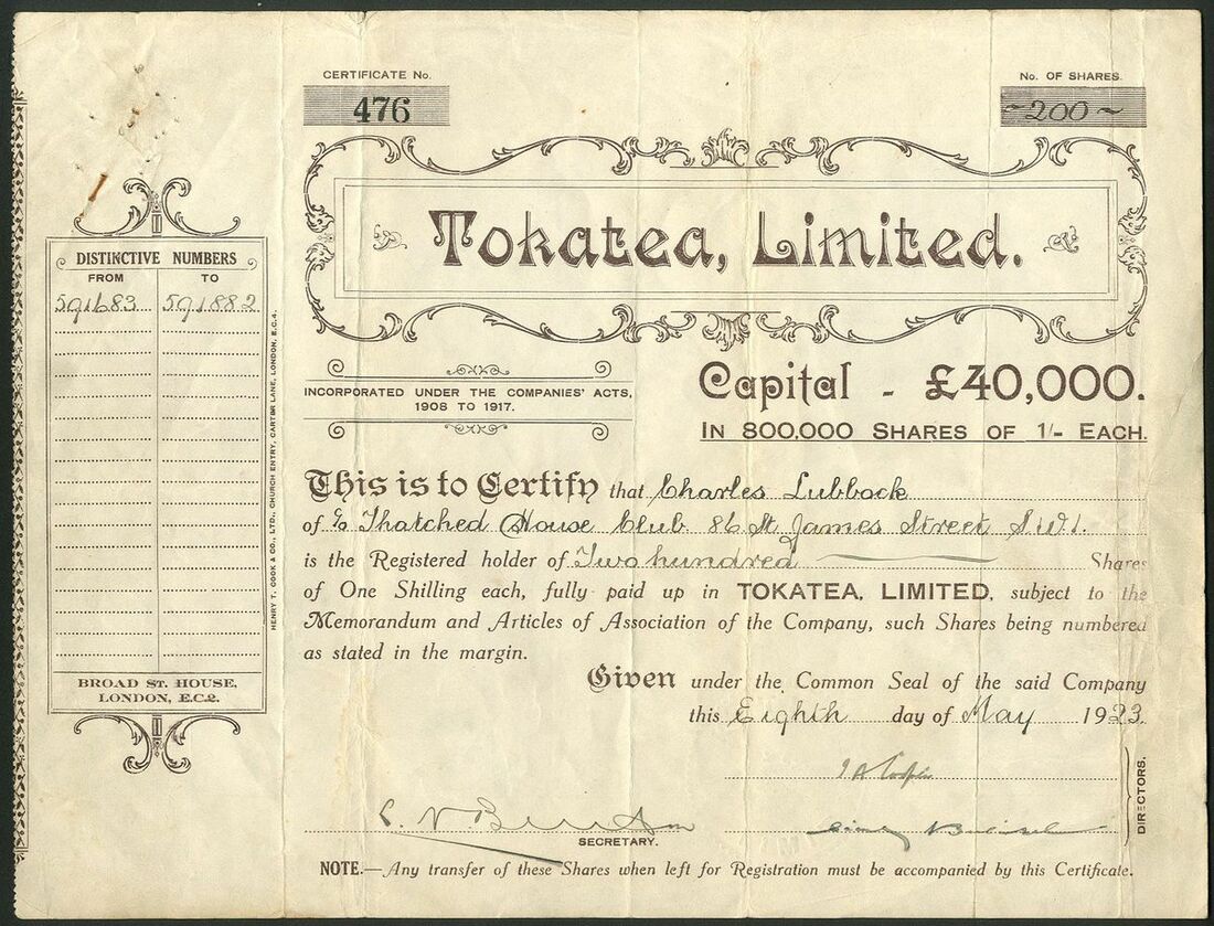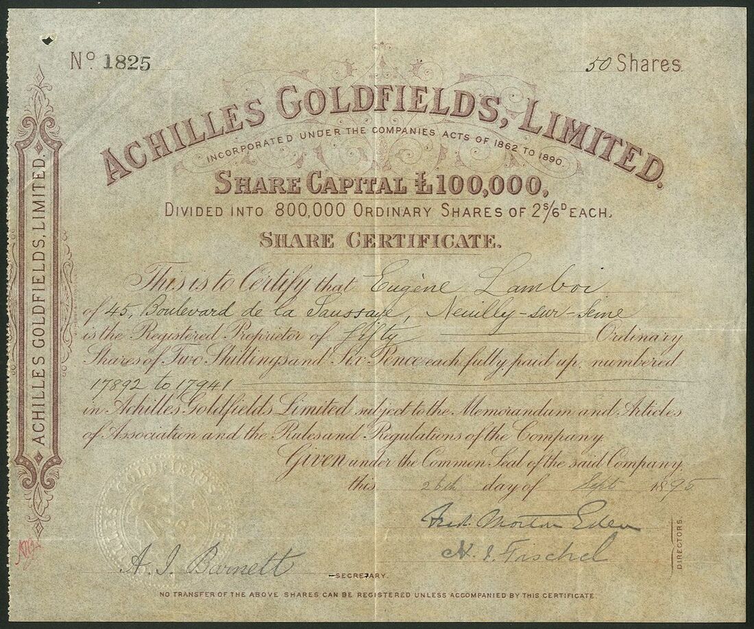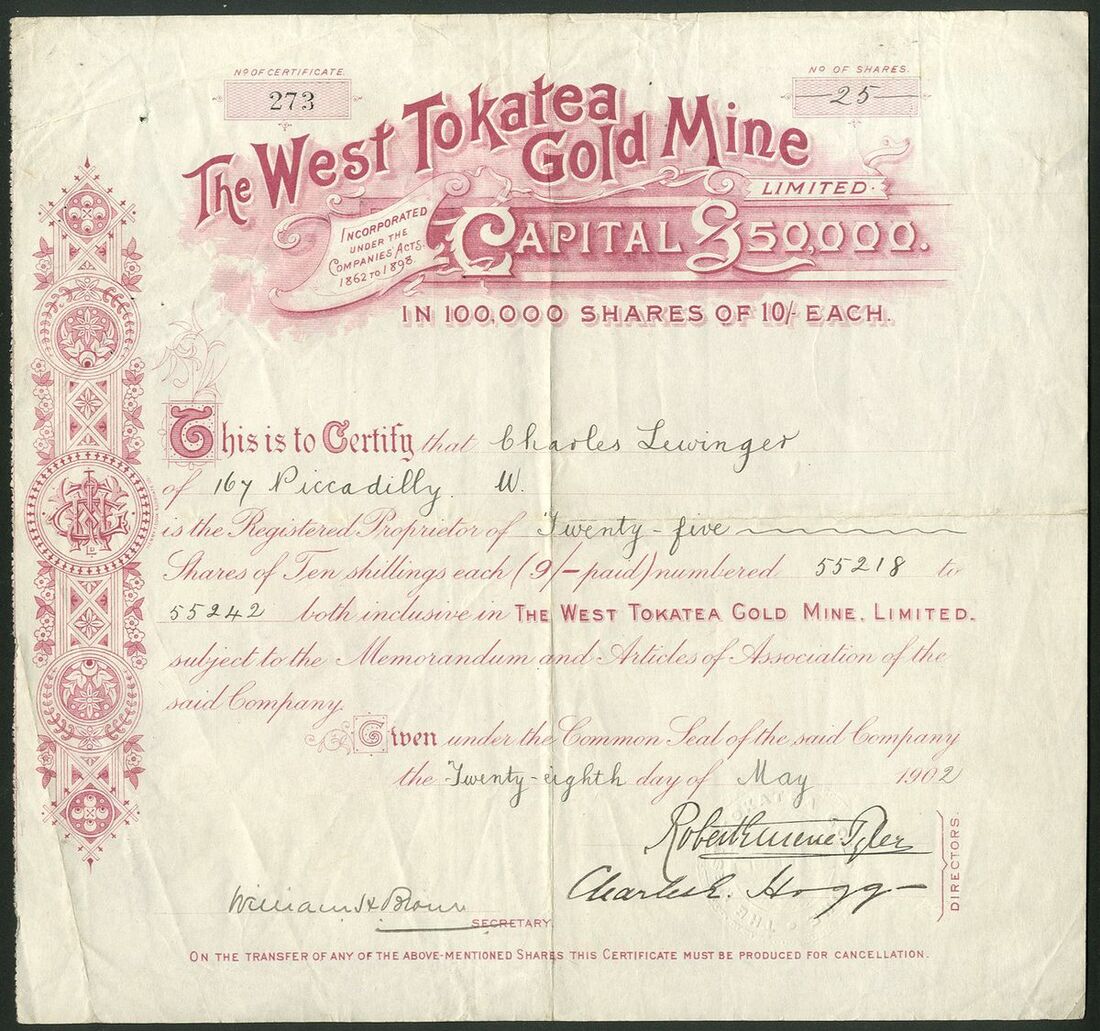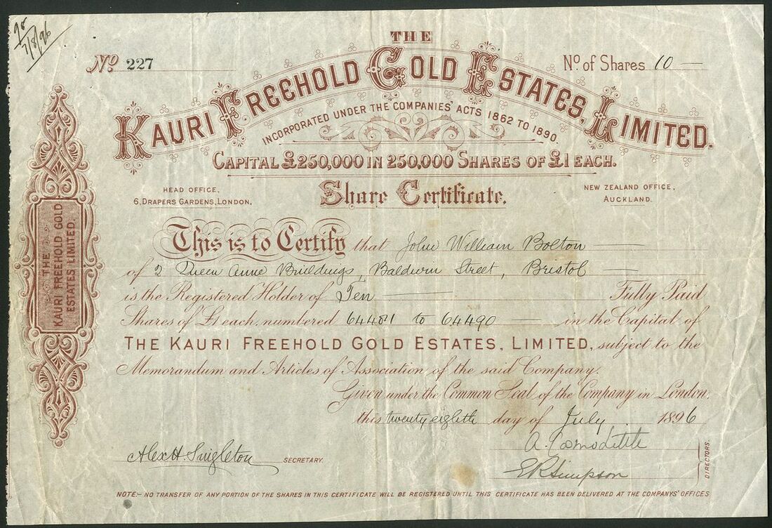 New Zealand: Four gold mining certificates comprising, Achilles Goldfields Limited, 2/6d shares, 18[95], #1825; Kauri Freehold Gold Estates Limited, £1 shares, 189[6], #227; West Tokatea Gold Mine Limited, 10/- shares, 190[2], #273, and, Tokatea Limited, 1/- shares, 19[23], #476. Generally fine and better but the first quite discoloured (4).