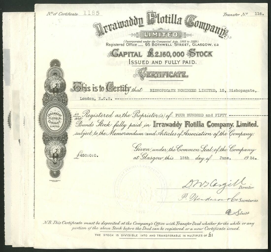 Burma: Irrawaddy Flotilla Co. Ltd., a group of 7 stock certificates, Glasgow 19[34] to 19[41], 3 varieties, tiny vignettes of Burmese peacock at left, black. Owned a large fleet of steamers, tugs and barges operating on Burma's river system. Taken over by the Burmese Government in 1948. VF or better (7).