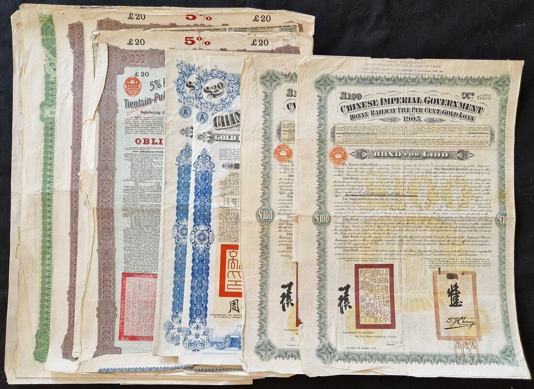 China: A group of Chinese Government and Railway bonds, comprising Honan Railway 1905, £100, 2 examples; Tientsin Pukow Railway, 1908, £20, German issue, 3 examples; Hukuang Railway 1911, French issue, £20 bonds, 3 examples, and, 1912 Gold 'Crisp' Loan, £20 bonds, 2 examples. One of the Hukuang is damaged otherwise VF or thereabouts (10).