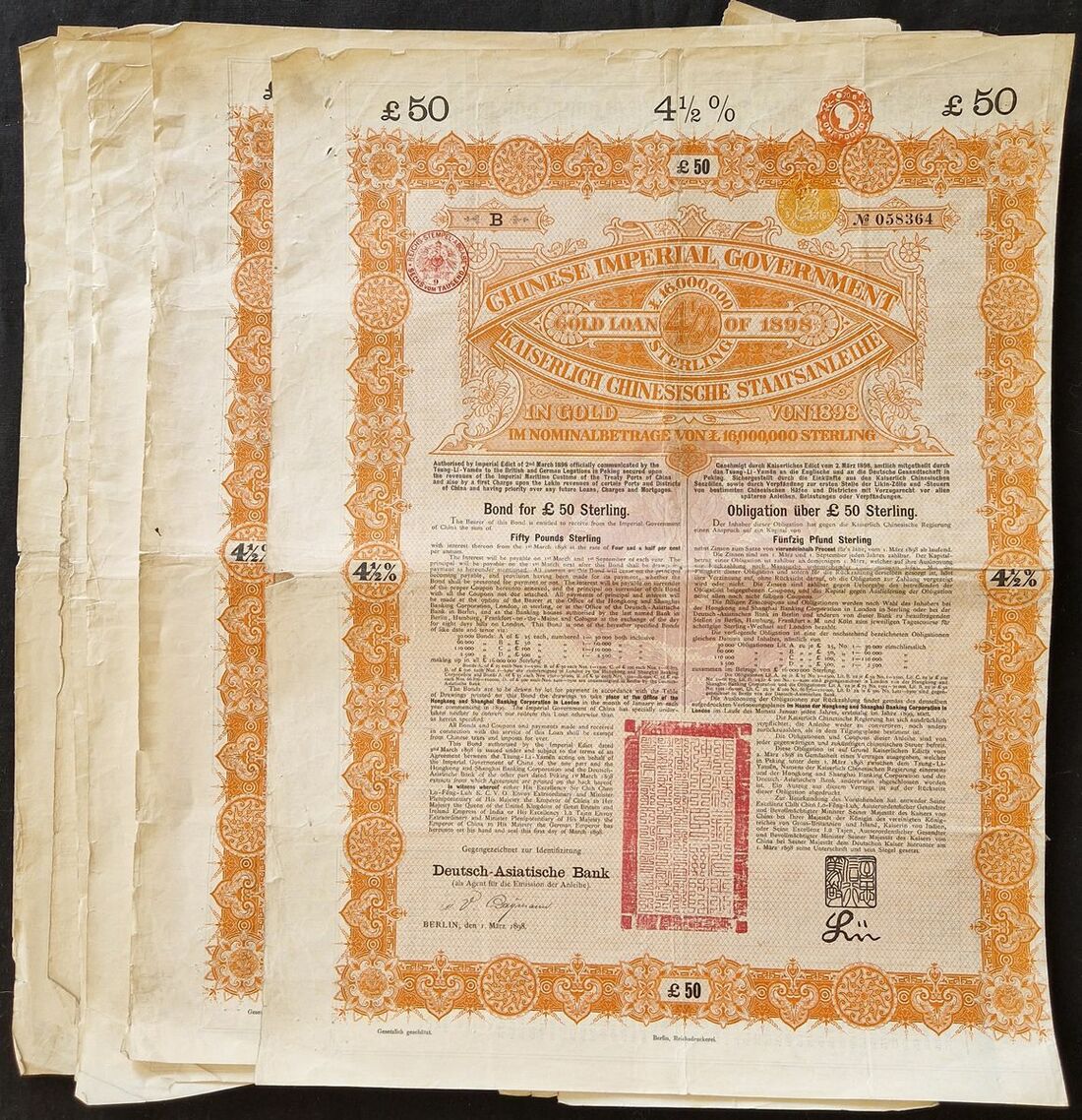 China: 1898 4½% Gold Loan, a group of bonds comprising £50, German, 4 examples, £100 German, 2 examples and £100, HSBC. Mixed condition, most with the usual edge nicks and a few tears, F-VF (7).