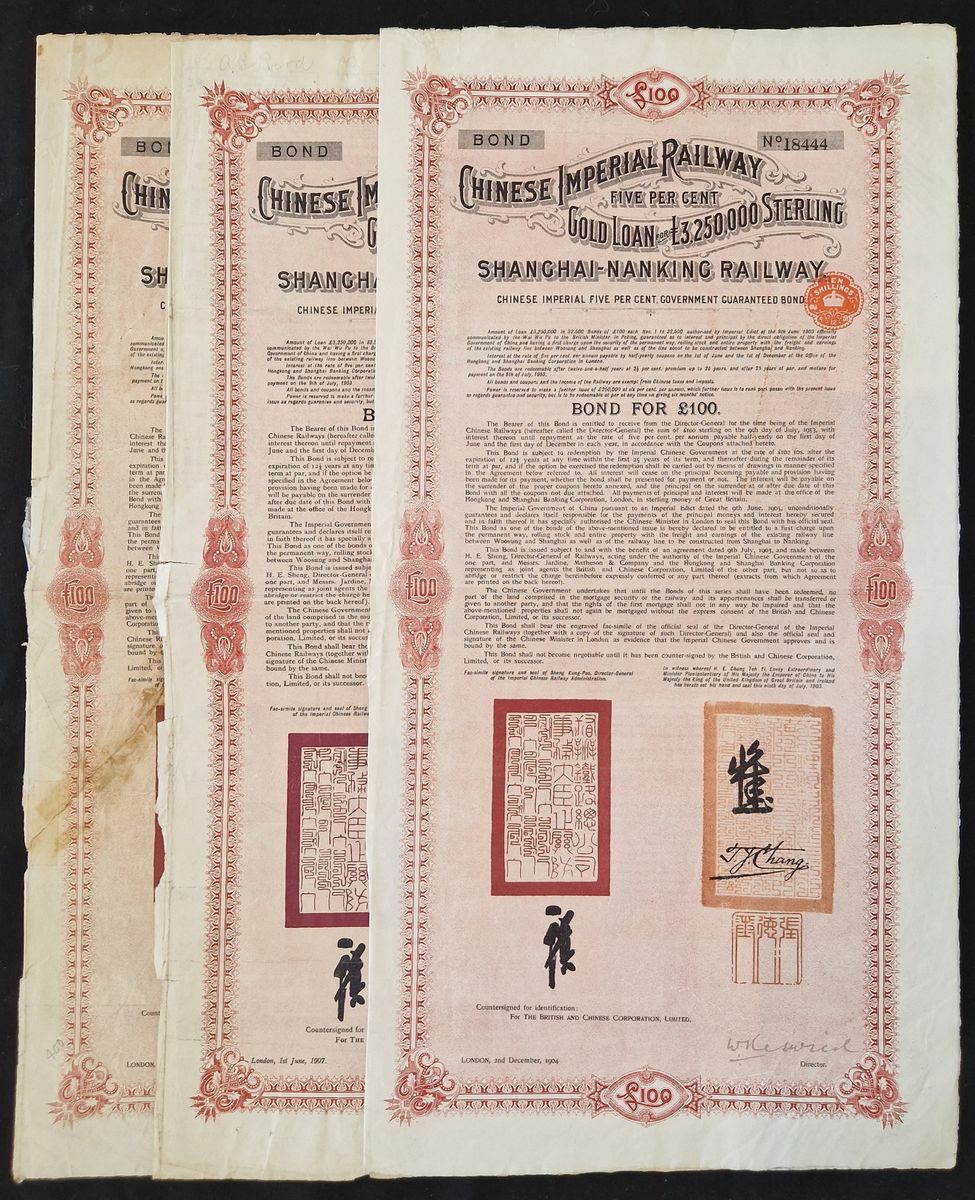 (x) China: Shanghai-Nanking Railway 5% Loan, a group of 3 bonds for £100, 1st issue, 1904 (2) and one 1907, large format, red and black, with coupons. One with repaired tears, the others VF (3).