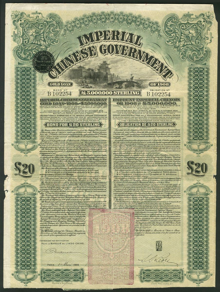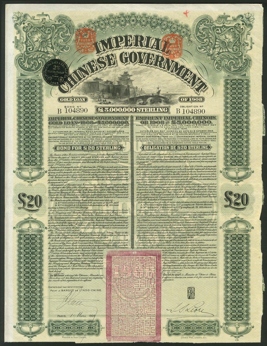 (x) China: 1908 5% Gold Loan, a pair bonds for £20 issued by the Banque de L'Indo-Chine, walled city at top, green and black, red chop bottom centre, printed by Waterlow, no coupons remain as is usual. One with edge tears - only F, the other VF (2).