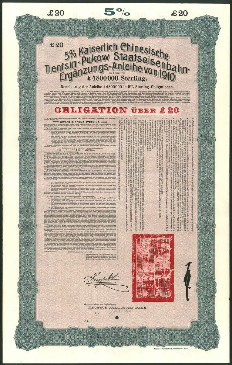 (x) China: 1910 5% Tientsin-Pukow Railway Supplementary Loan, a group of 10 reserve stock £20 bonds, issued by the Deutsch-Asiatische Bank, large format, green and black with mauve underprint, each with full sheet of coupons, no serial numbers, small hole cancellation. Almost UNC (10 examples).
