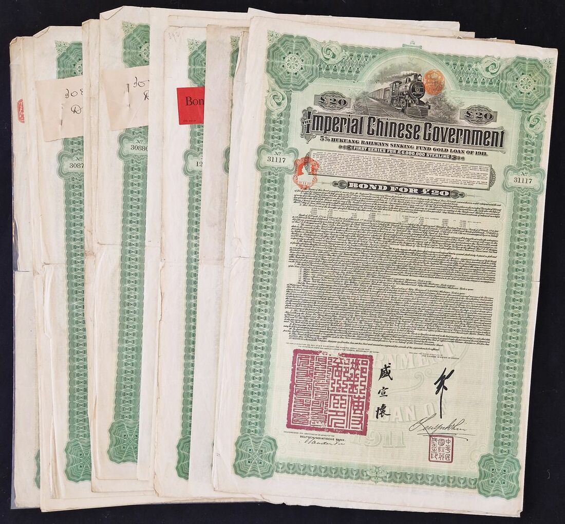 (x) China: 1911 Hukuang Railways 5% Gold Loan, a group of 14 bonds for £20, issued by Deutsch-Asiatische Bank, large format, green and black, with coupons. Generally AVF (14).