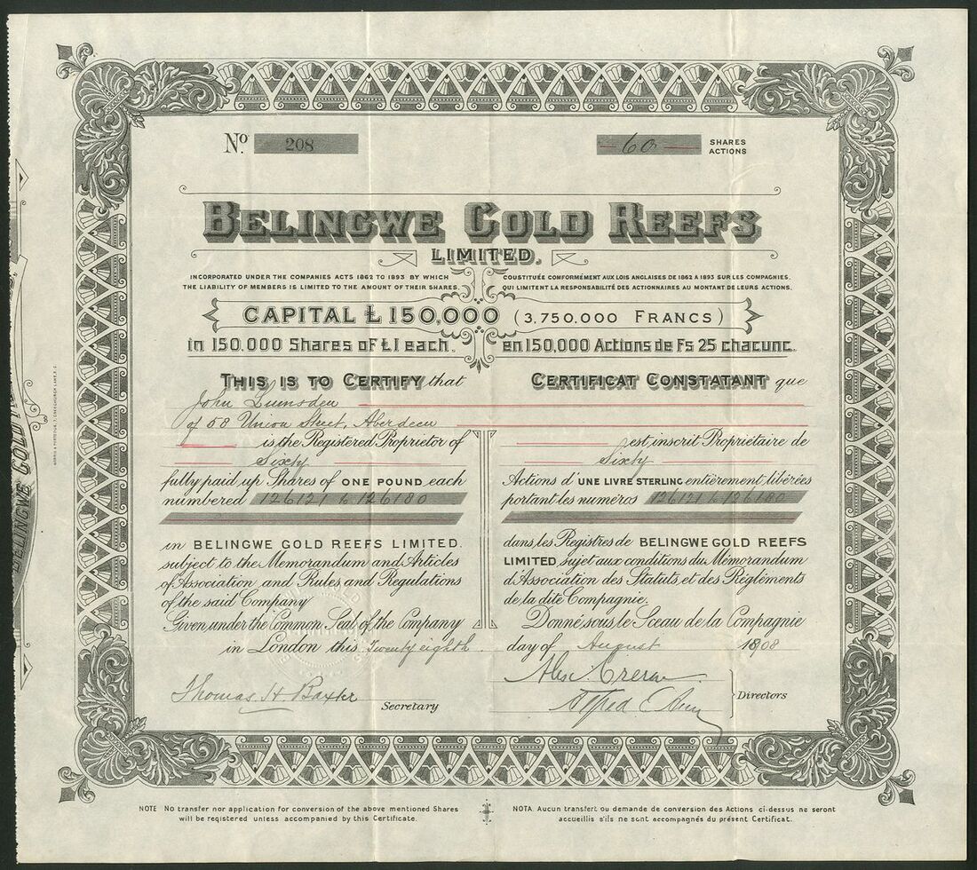 Rhodesia: Belingwe Gold Reefs Limited, £1 shares, 18[1908], #208, ornate border, black, text in English and French. Registered 2nd April 1897 to acquire 280 claims in the Bulawayo, Belingwe and Filabusi districts, also the Insukamine farm 12 miles from Gwelo. VF and rare. First time seen at auction.