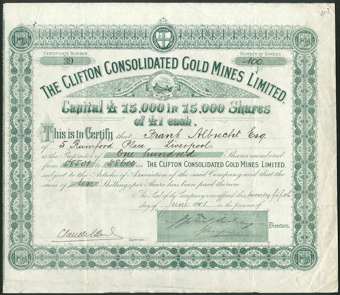 Rhodesia: Clifton Consolidated Gold Mines Ltd., £1 shares, 190[1], #39, ornate border, green, together with related papers. Formed to acquire 200 mining claims in the Belingwe District of Rhodesia. Spike holes top left, AVF and rare..