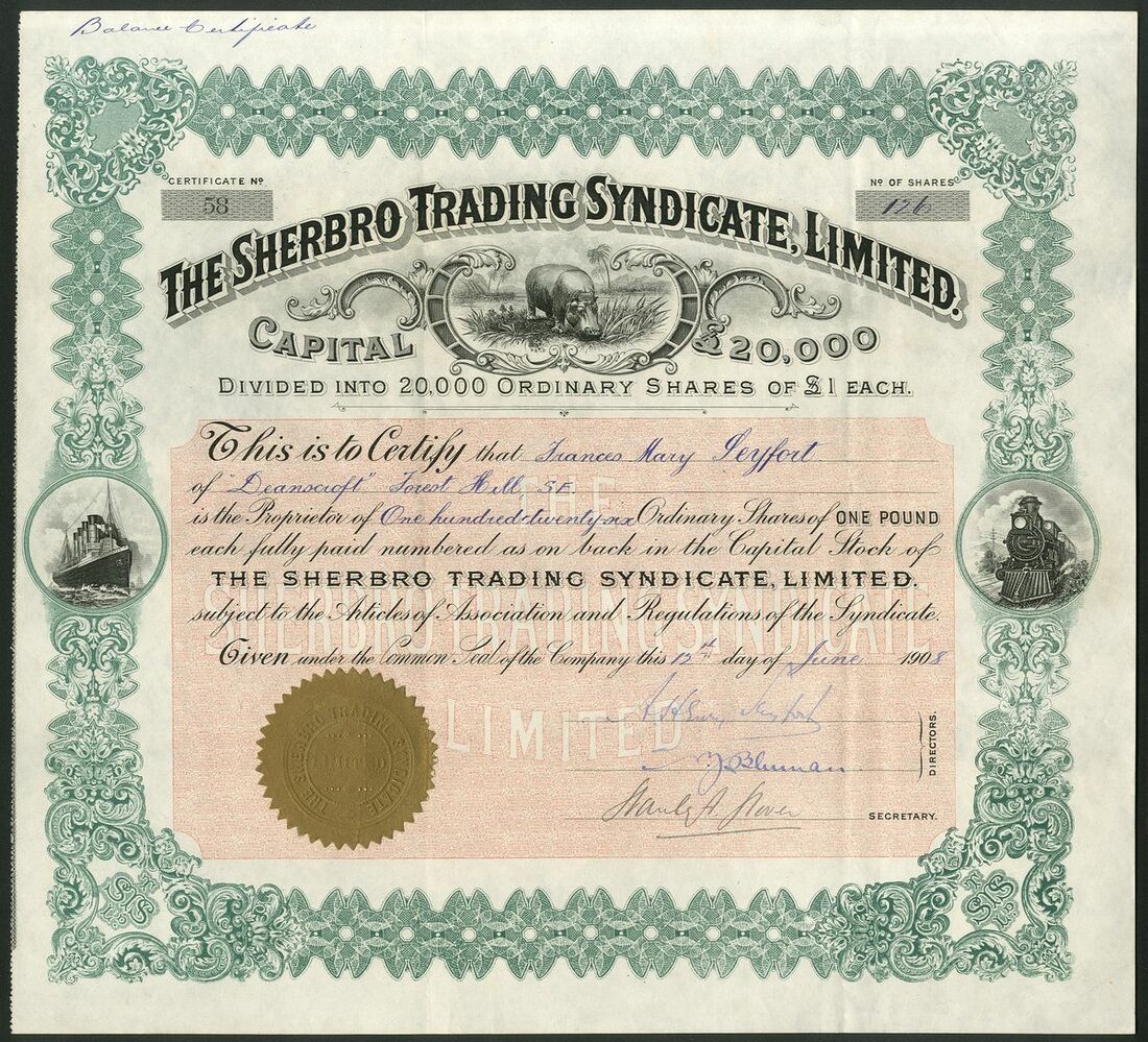 Sierra Leone: Sherbro Trading Syndicate Ltd., £1 shares, 190[8], #58, hippopotamus in centre with small vignettes of steamship and steam train at either side, ornate border, green and black, pink underprint, gold seal. Sherbro Island is off the coast of Sierra Leone and hosted a British Naval post to fight slavery after its abolishment in the early years of the 19th Century. AEF.