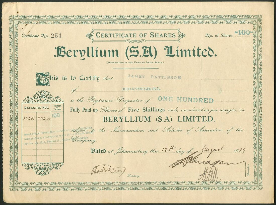 South Africa: Beryllium (S.A.) Limited, 5/- shares, Johannesburg 19[29], #251, green. Rust marks top left otherwise EF and scarce.