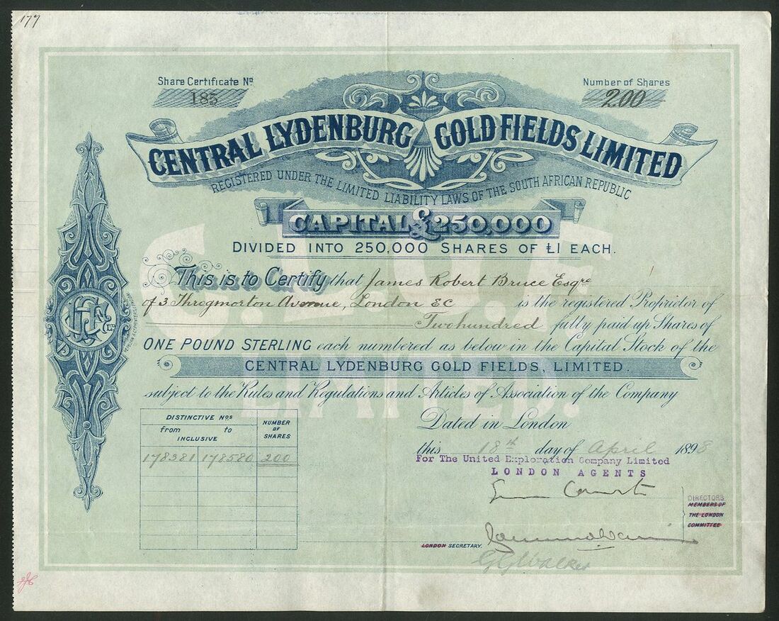 South Africa: Central Lydenburg Gold Fields Ltd., £1 shares, London 189[8], #185, ornate title with scrollwork, blue with green underprint. Registered in 1895 and owned 235 claims on the farms Peach Tree and Blackhill, Transvaal. GEF.