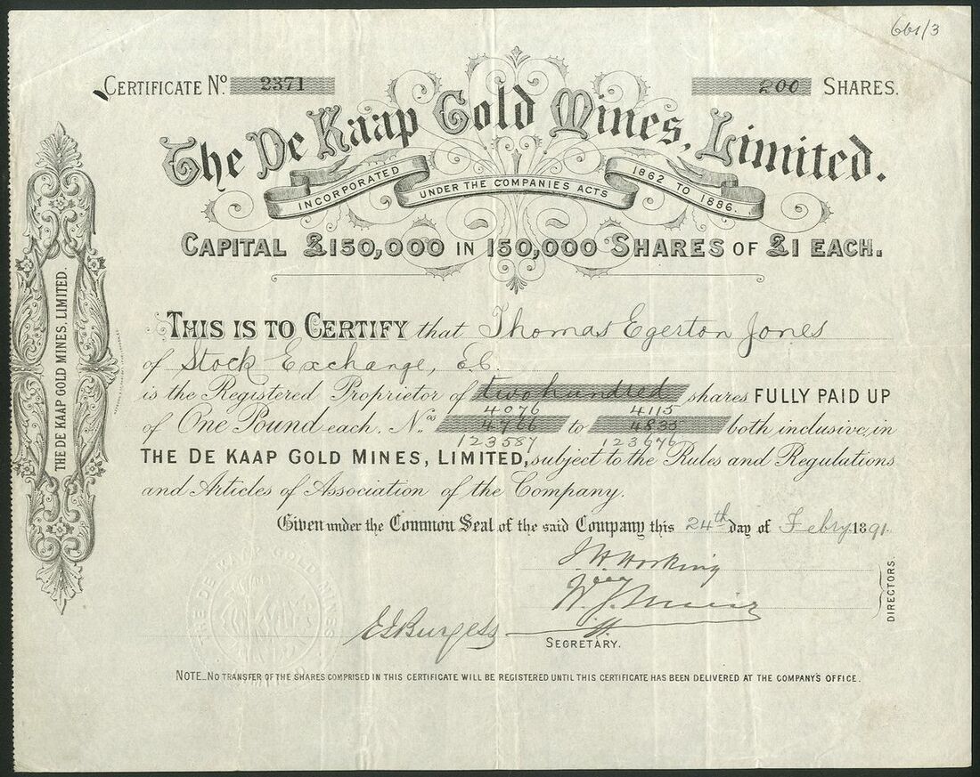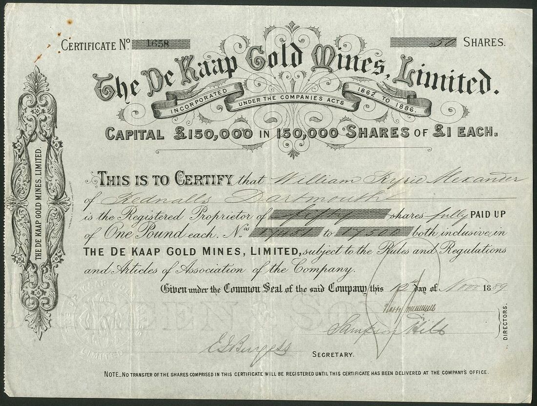 South Africa: De Kaap Gold Mines Ltd., pair of certificates for £1 shares, 18[89] and 18[91], #1658 and #2371, both of same design with ornate title and scrollwork, black, printing variation 'fully paid up' on latter piece in place of 'paid up' on the first. Spike/pin holes, VF. (2)
