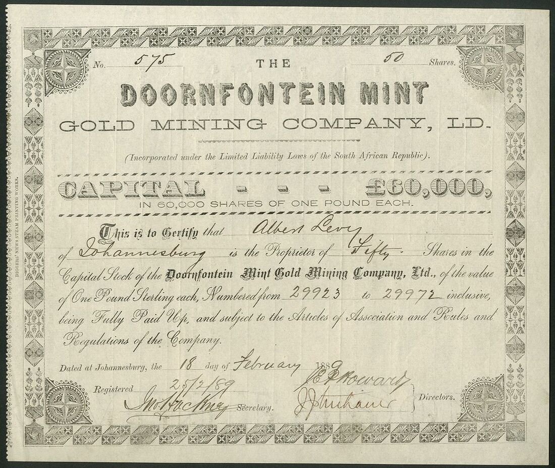 South Africa: Doornfontein Mint Gold Mining Company Ltd., £1 shares, fully paid, Johannesburg 188[9], #575, ornate border, black. Acquired claims on the Witwatersrand on which a 5 foot wide reef was struck yielding 1oz gold per ton. EF.