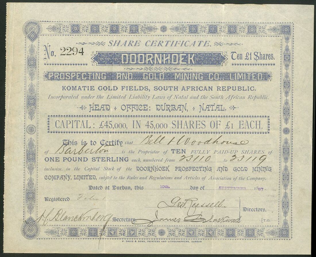 South Africa: Doornhoek Prospecting and Gold Mining Co. Ltd., pair of certificates for ten £1 shares, fully paid, 18[87], #2294 and 5/- paid, 18[87], #5528, both ornate blue printing. Incorporated in Natal and the South African Republic with Head Office in Durban. Mines on the Komatie Goldfields. Both GVF (2).