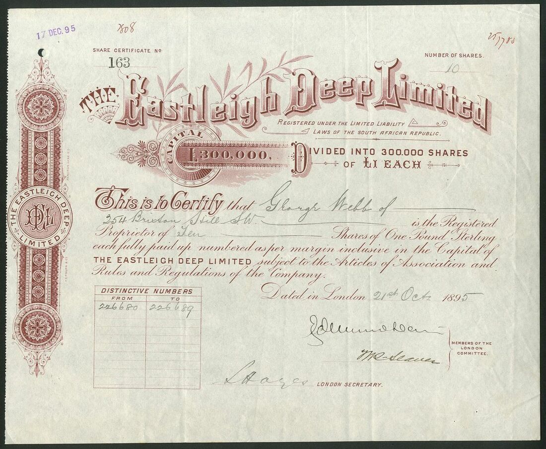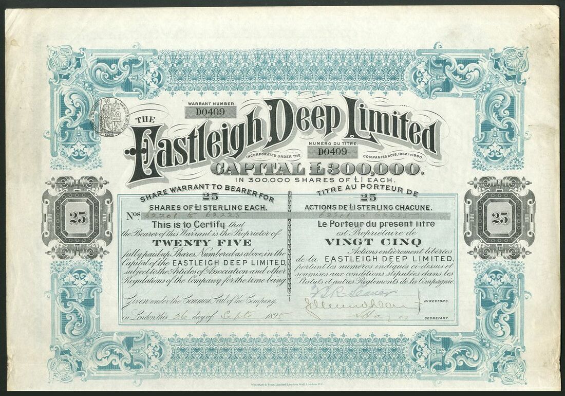 South Africa: Eastleigh Deep Ltd., £1 shares, 189[5], #163, decorative mauve printing, together with bearer warrant for 25 shares, also 189[5], #D0409, this piece larger with text in English and French, coupons, ornate border, black and turquoise. Both VF (2).