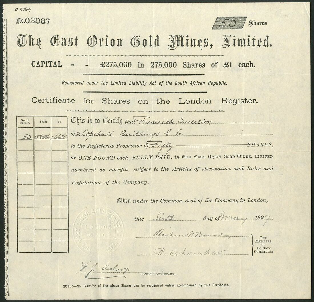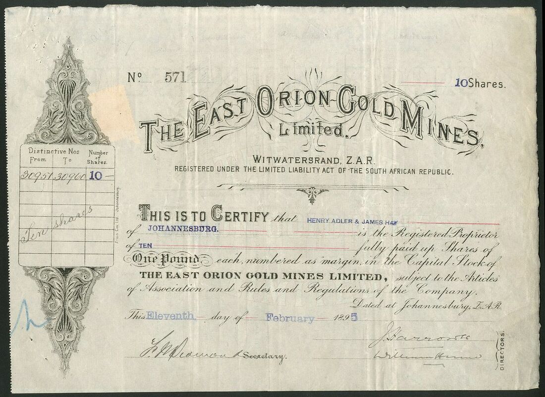 South Africa: East Orion Gold Mines Ltd., £1 shares, Johannesburg 189[5], #571, decorative black printing, and £1 shares, London Register 189[7], #03087, black. Registered in the Transvaal 22nd January 1895 to acquire the assets of the New Black Reef Company, a total of 572 claims in southern Witwatersrand. Both VF. (2)