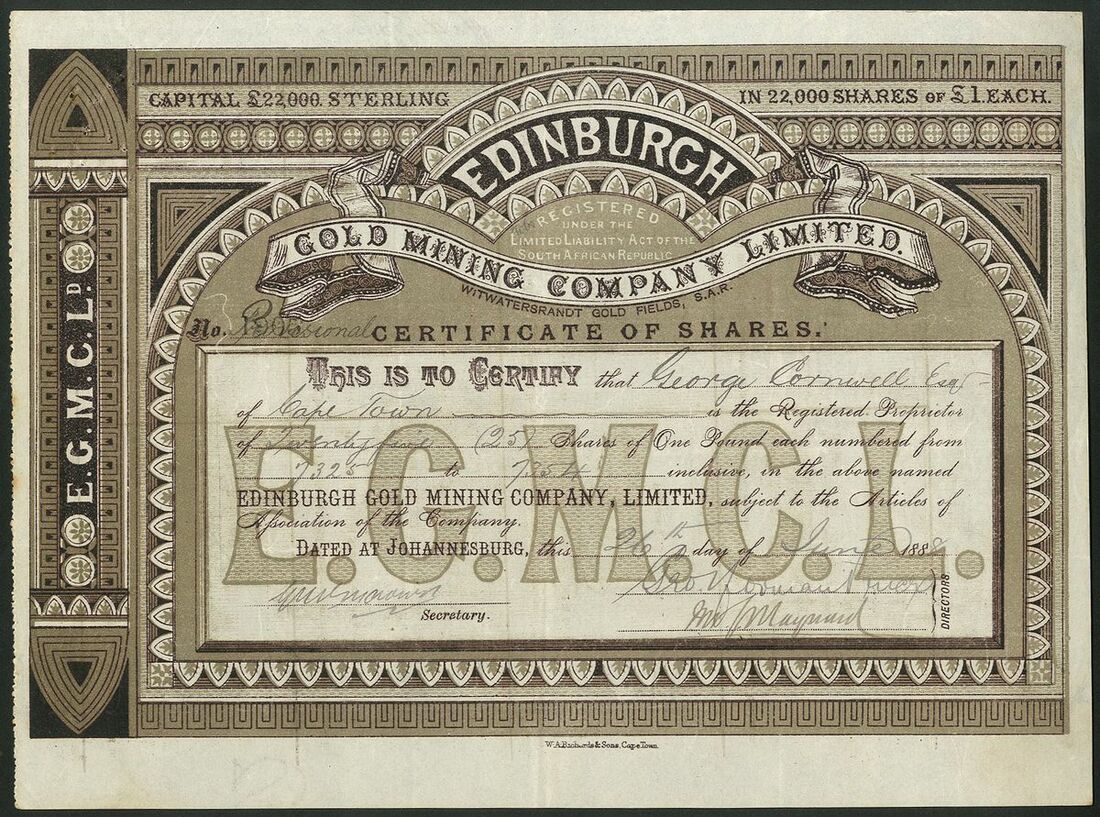 South Africa: Edinburgh Gold Mining Co. Ltd., £1 shares, 188[8], number overwritten with 'provisional', unusual ornate design in gold and brown tones. GVF.