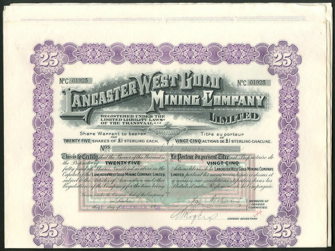 South Africa: Lancaster West Gold Mining Co. Ltd., Transvaal, a group of 9 x bearer warrants for 25 shares of £1, London 19[09], mauve and black, with all coupons. Owned claims adjoining the Lancaster Gold Mining Company, including Botha Reef and Battery Reef. EF (9).