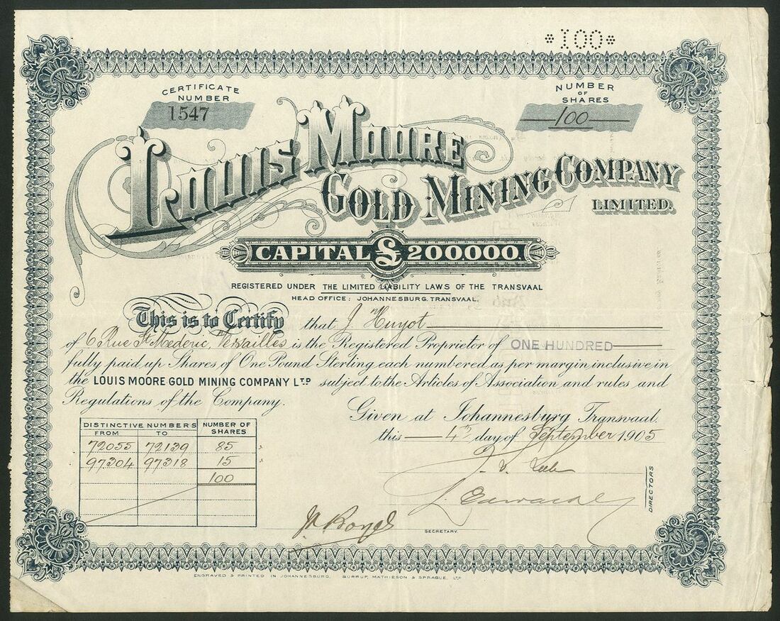 South Africa: Louis Moore Gold Mining Co. Ltd., £1 shares, Johannesburg 190[5], #1547, decorative title and border, dark blue. Owned claims about 110 miles from Pietersburg, Transvaal. Rough right edge, otherwise VF and scarce.
