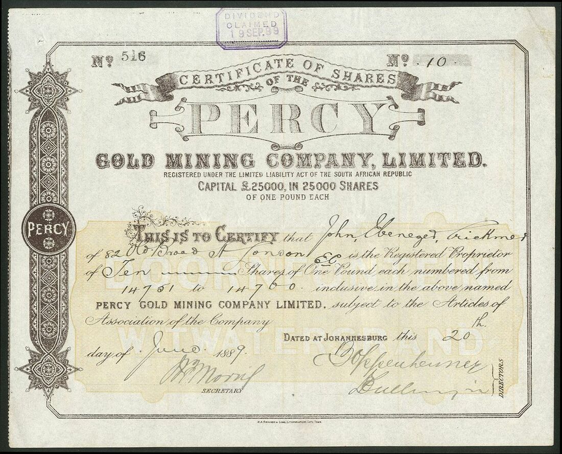 South Africa: Percy Gold Mining Company Ltd., £1 shares, Johannesburg 188[9], #516, signed by Bernard Oppenheimer as Director, decorative brown printing. Doornfontein, Witwatersrand in underprint. Bernard Oppenheimer 1866-1921, a South African-British diamond merchant and philanthropist. He was chairman of numerous diamond mining companies and went on to found the Bernard Oppenheimer Diamond Works for injured and disabled soldiers, in Brighton. For this he was made Baronet in 1921, also sadly the year of his death at only 55. Single spike hole top left, near EF.