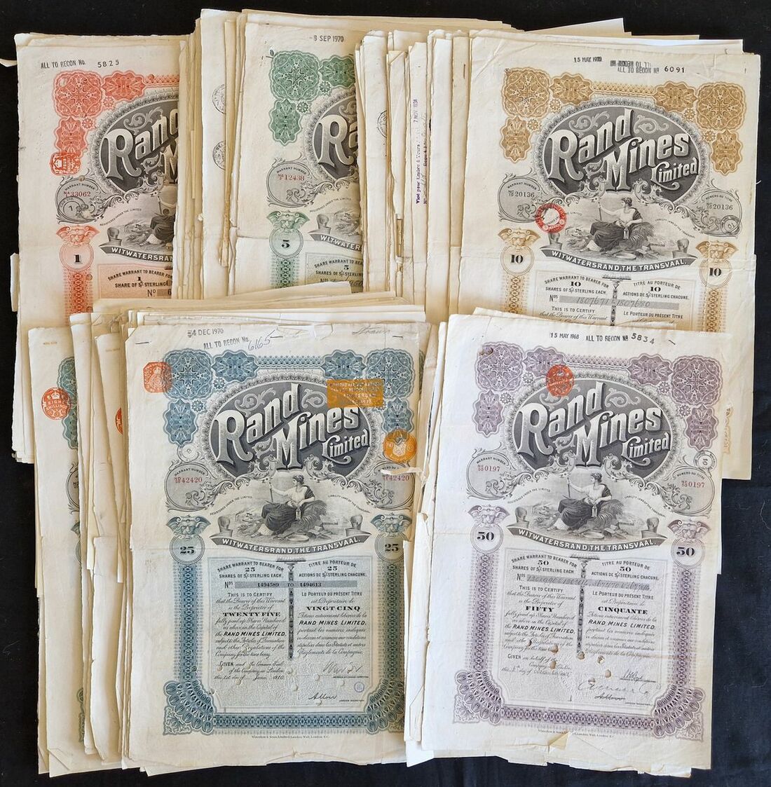 South Africa: Rand Mines Limited, a group of certificates for 1 share (12), 5 shares (22), 10 shares (19), 25 shares (27) and 50 shares (4), dated 19[11] to 19[39], showing Transvaal under the vignette, attractive pieces with allegorical female in centre, red, green, brown, blue and mauve respectively, printed by Waterlow & Sons, hole cancelled, some with coupons, the last rare. F-VF (84)
