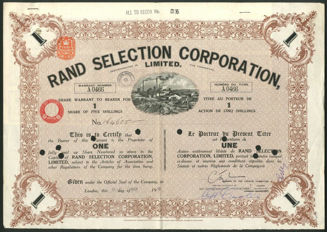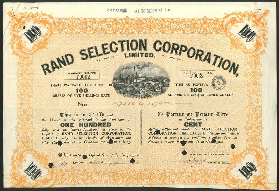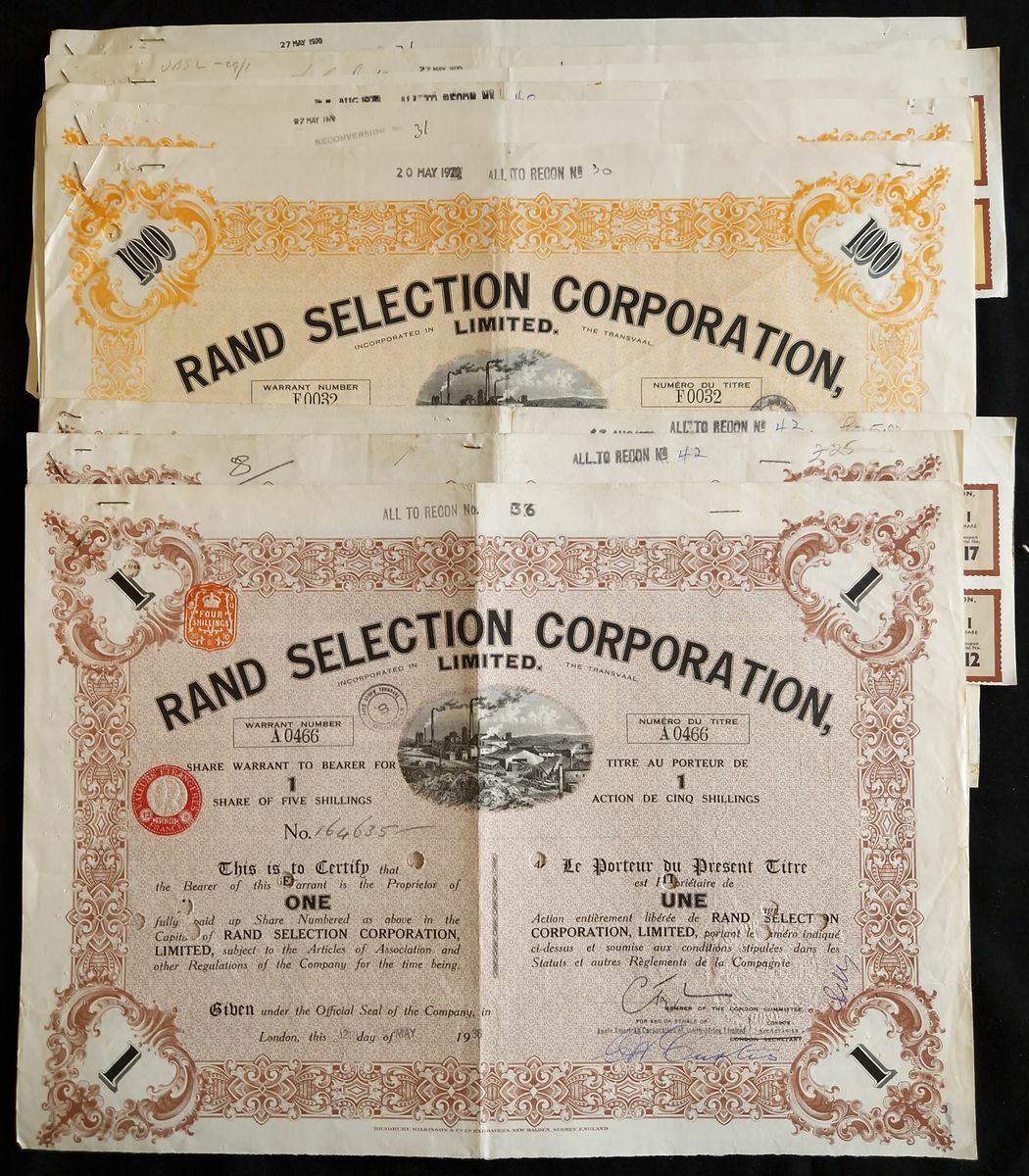 South Africa: Rand Selection Corporation Limited, a group of bearer certificates for 1 share, 19[36] (3) and 100 shares, 19[26] (5), mine buildings in centre, brown and orange respectively, all low serial numbers, with coupons, hole cancelled. Incorporated in the Transvaal 15th October 1889 as the Transvaal Coal Trust Co. Ltd. Name changed 29th August 1916 when most of its revenue was derived from mining interests. VF and better (8).