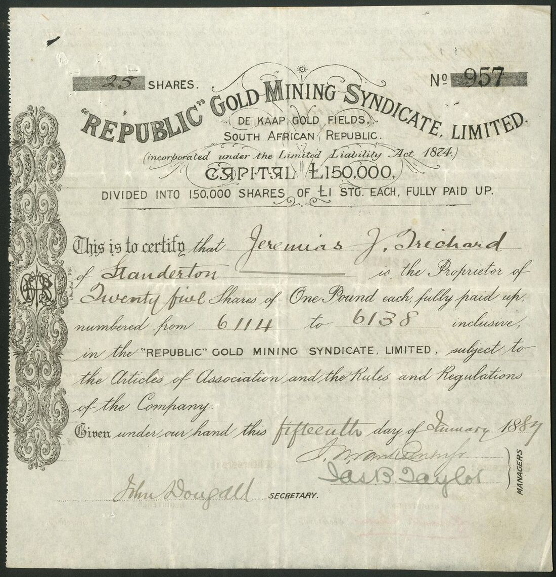 South Africa: "Republic" Gold Mining Syndicate Ltd., £1 shares, 18[87], #957, signed by James B. Taylor as manager, scrollwork at left, black. James Benjamin Taylor (1860-1944), a so-called Randlord, pioneer of South African diamond and gold mining, early partner of Alfred Beit in Werner, Beit & Co., helped found 'Corner House'. Retired a multimillionaire at the age of 34. This company owned property in the De Kaap Gold Fields. VF. NO RESERVE