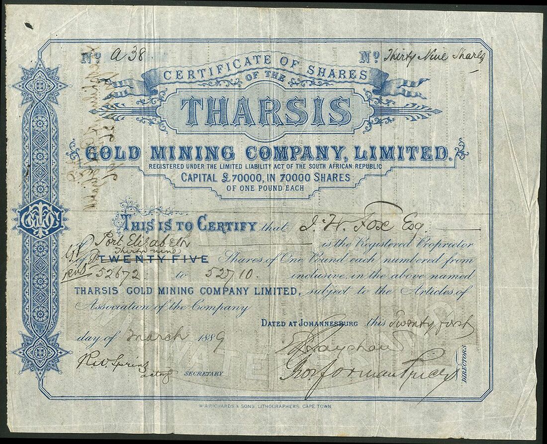 South Africa: Tharsis Gold Mining Company Ltd., £1 shares, Johannesburg 188[9], #a38, attractive blue printing. About 235 acres on the Main Reef at Paardekraal. Creasing, spike hole top left, AVF.