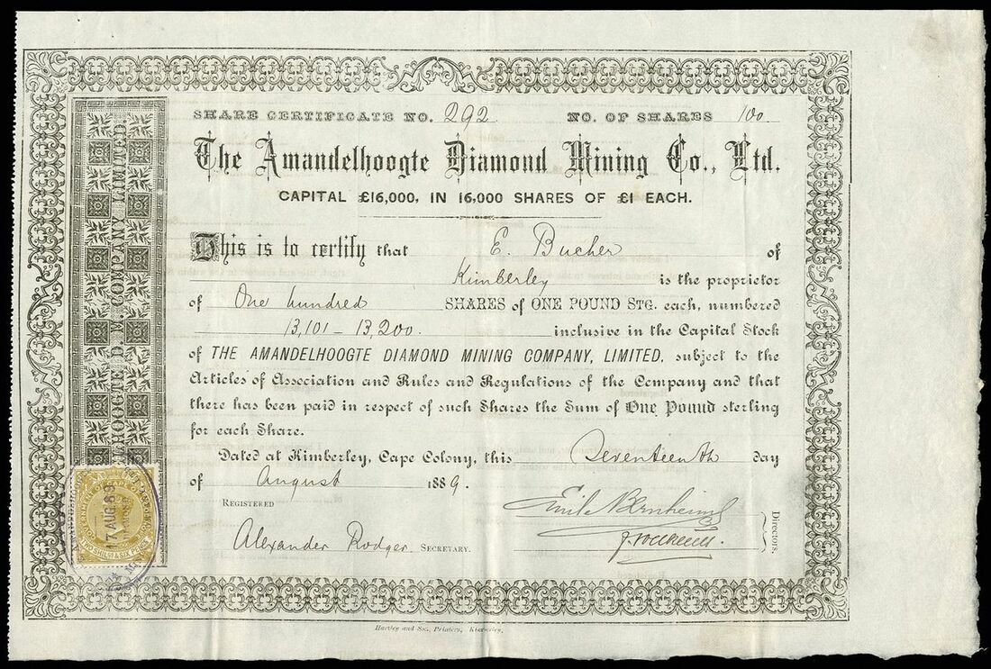 South Africa: Amandelhoogte Diamond Mining Company Ltd., £1 shares, Kimberley 188[9], #292, black with revenue stamp. GVF and rare.