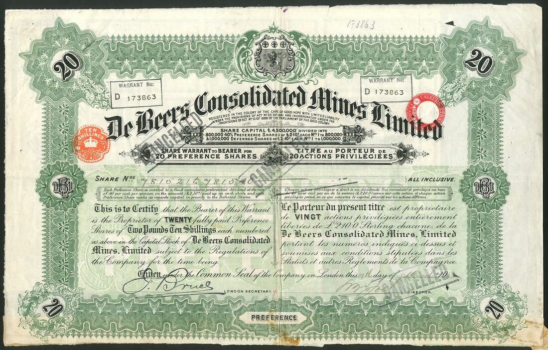 South Africa: De Beers Consolidated Mines Limited, bearer warrant for 20 preference shares of £2 10/-, London 19[13], #D173863, signed by S B. Joel as Director, ornate border, green and black, with coupons, cancelled. A few small stains, VF.