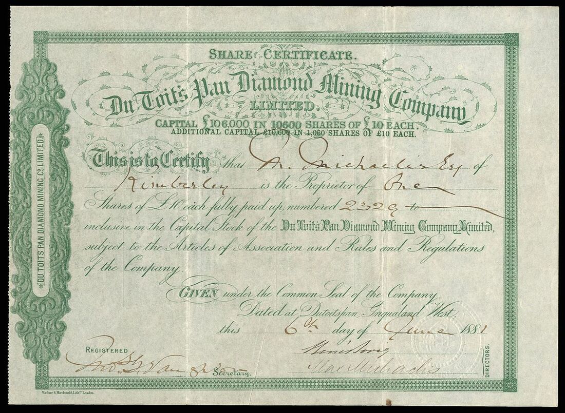 South Africa: Du Toit's Pan Diamond Mining Company Ltd., £10 shares, Dutoitspan, Griqualand West 188[1], issued to and signed by Max Michaelis both as Director and on the reverse, green. VF and rare.