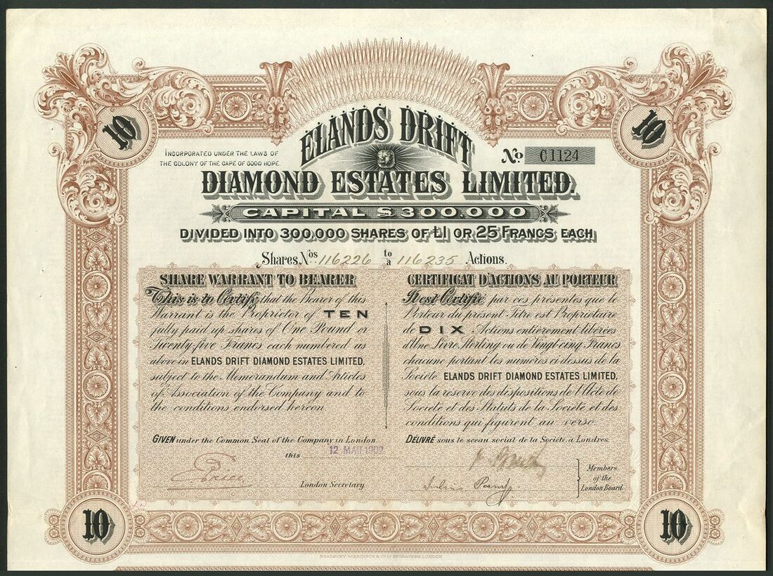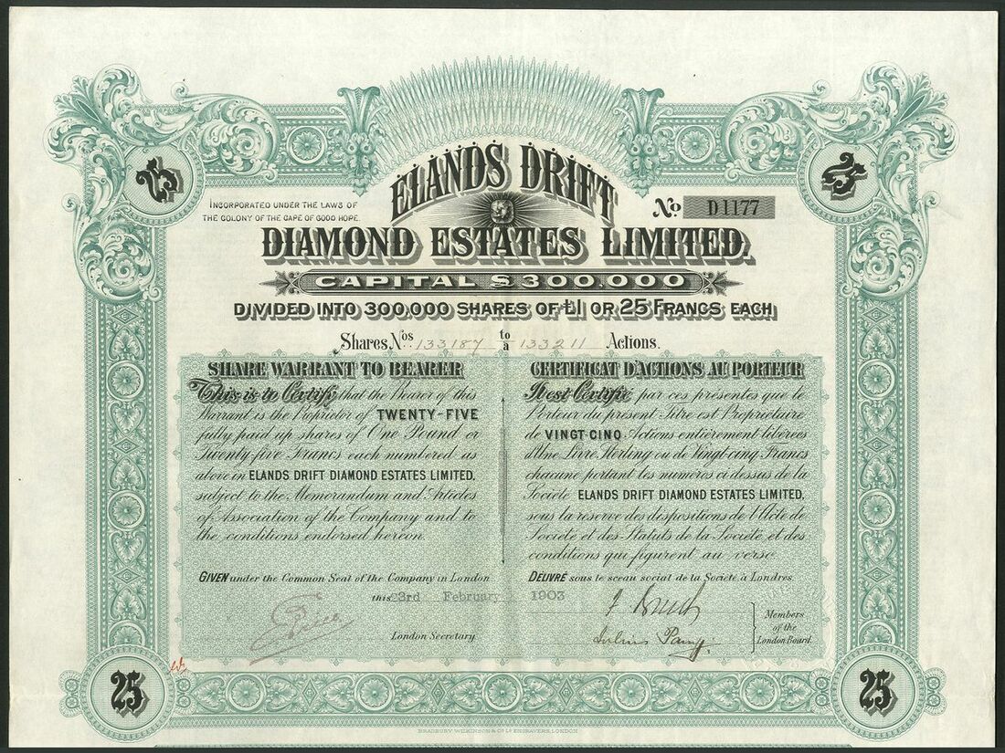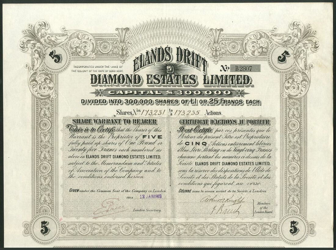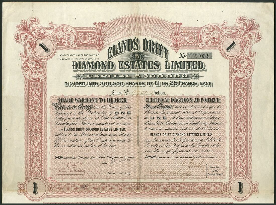 South Africa: Elands Drift Diamond Estates Ltd., a group of bearer share warrants for 1, 5, 10, and 25 shares of £1, 1902/03, printers Bradbury, Wilkinson & Co., ornate borders, mauve #A1003, grey #B2807, brown #C1124 and green #D1177 respectively, text in English and French, with coupons. The first VF, others better (4).