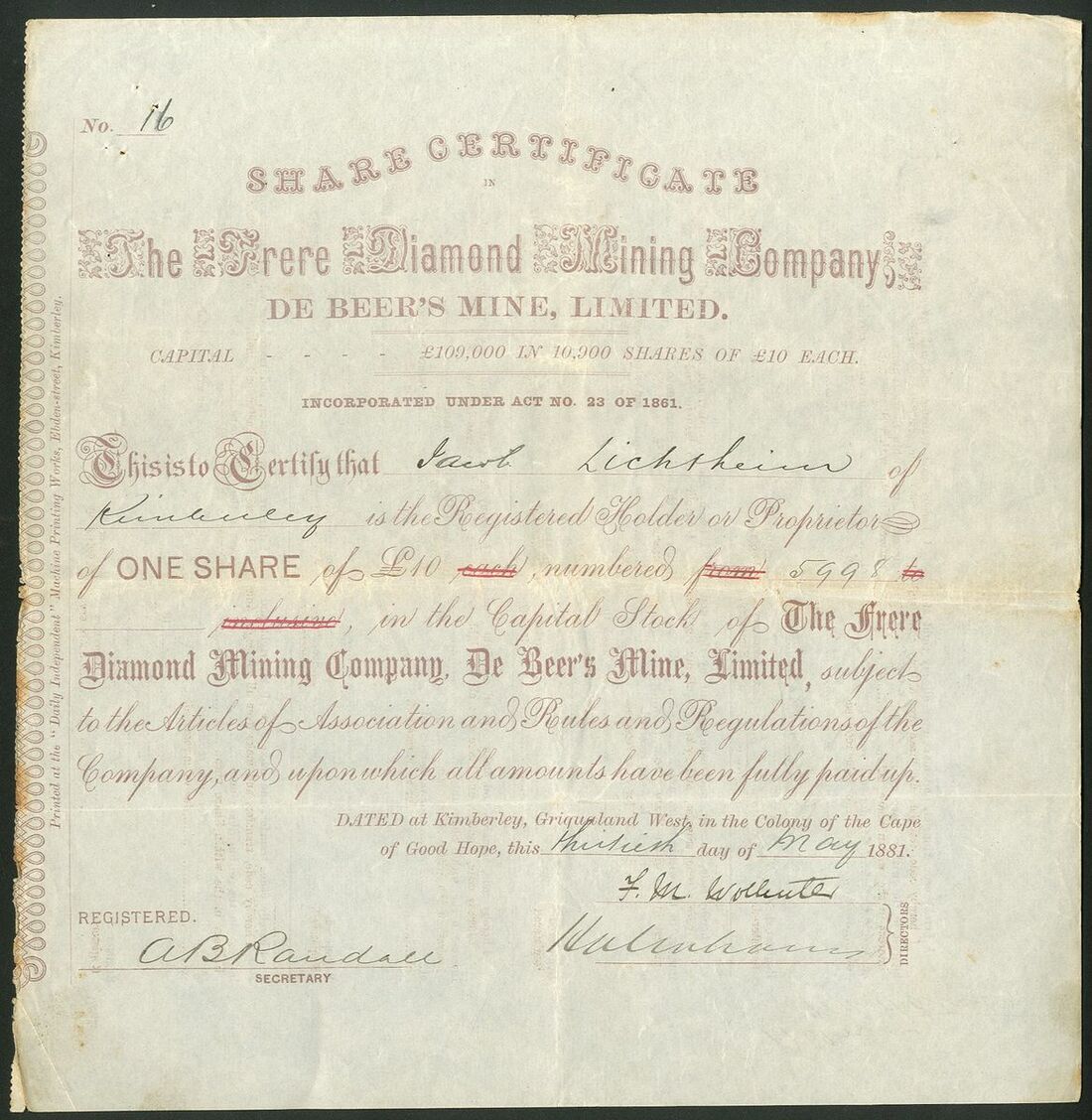 South Africa: Frere Diamond Mining Company, de Beer's Mine, Ltd., £10 share, Griqualand West 1881, fully paid, #16, pale mauve printing, printed in Kimberley. A little toning otherwise VF and scarce.