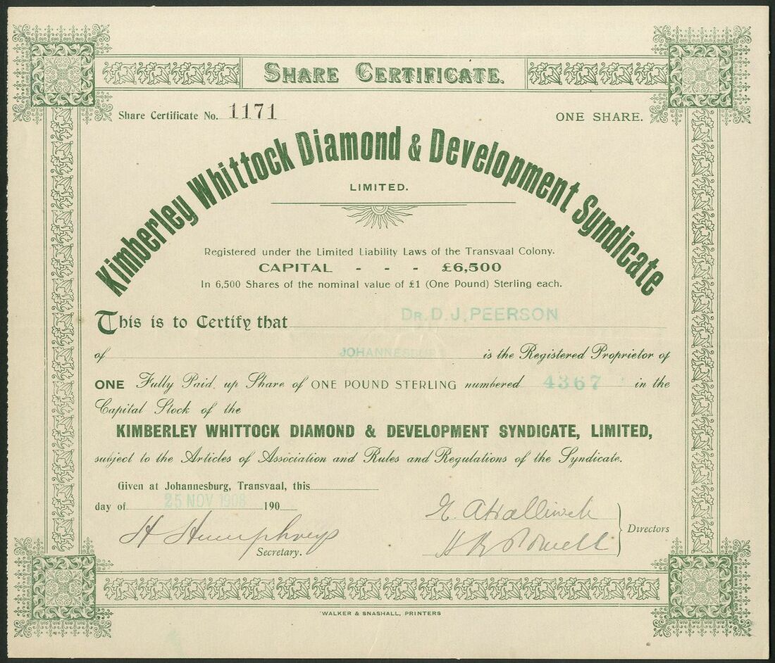 South Africa: Kimberley Whittock Diamond & Development Syndicate Ltd., £1 shares, 190[8], #1171, green. AEF.