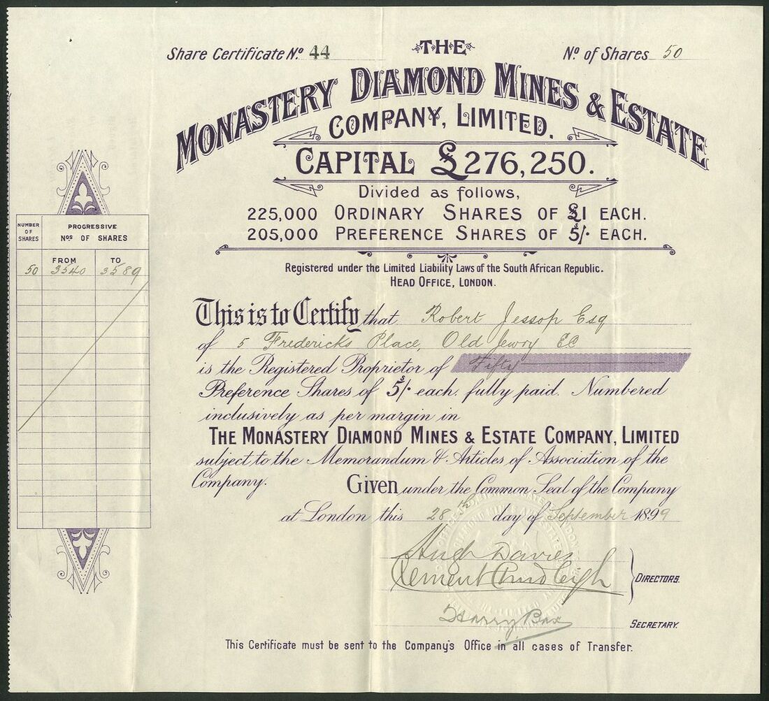 B>South Africa: Monastery Diamond Mines and Estate Company Ltd., 5/- preference shares, London 189[9], #44, mauve. GVF and scarce type.