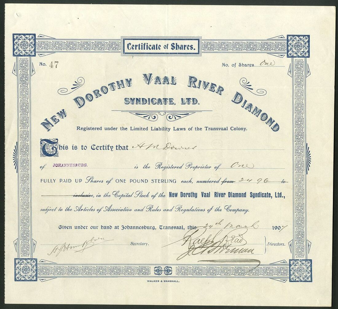 South Africa: New Dorothy Vaal River Diamond Syndicate Limited, £1 shares, Johannesburg 190[7], #47, blue. GVF and rare.